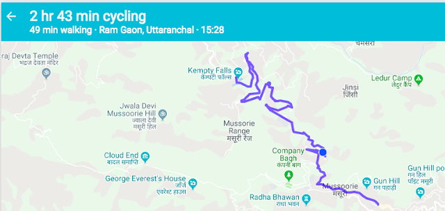 After checking-in at the hotel, I looked nearby for breakfast options and found one south Indian restaurant called UDUPI to have Uttappam Sambhar. I was feeling tired because of overnight train journey and therefore, took a 2 hour nap & got ready by 12.30 PM to kick-start my solo-trip day. While wandering around Mall road I saw many street vendors renting mountain bikes (bicycles) for going to nearby attractions. I thought rather than hiring a taxi, hiring a mountain bike would be a better option and it would be so much fun to see Mussoorie over a bicycle with rent of Rs. 100/hour. The guy told me that I can go to nearby attractions such as Camel back road & company garden. I heard about kemptyfalls a lot and asked him whether I can go there by this bike. He laughed and said yes, you can go easily downhill but while coming back it will be too much incline and difficult to peddle the bike uphill. Nevertheless, I wore my winter cap & took the decision to take the bike till Kempty Falls from Mall road which is 14km one-way distance with the "Dekh Lenge" attitude.